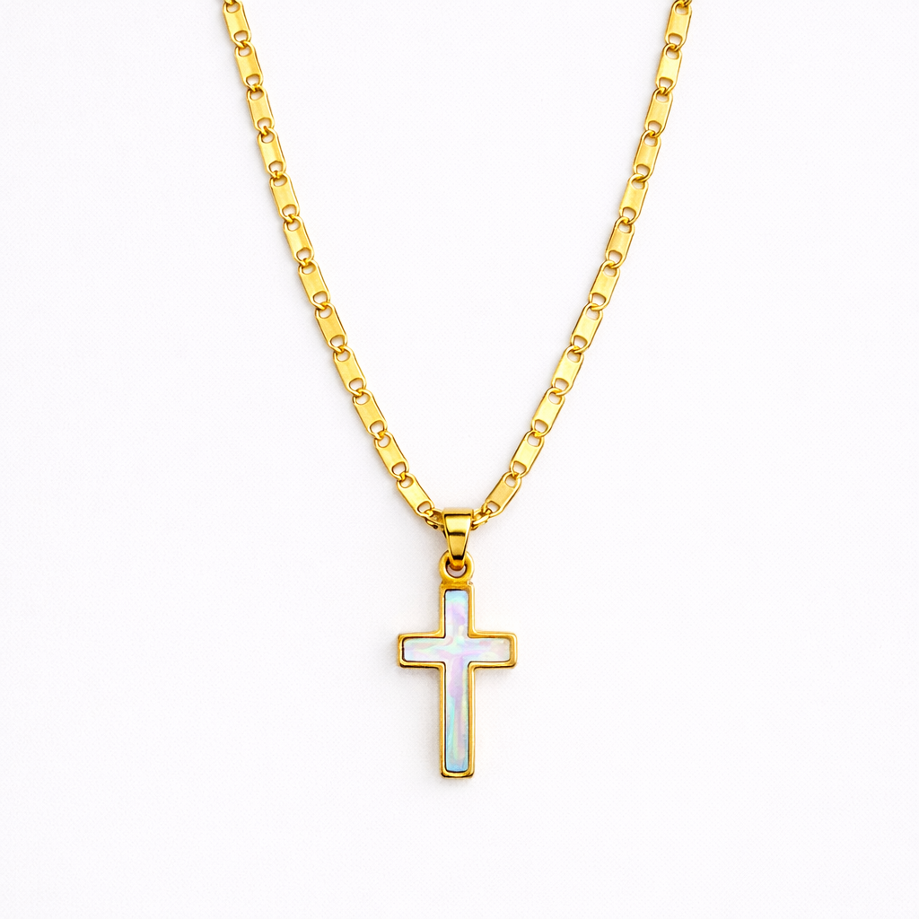 The Aura Cross Necklace glows with a dreamy opal-inspired center that catches the light in the prettiest way. Delicate. feminine. and effortless to style. it adds a soft shimmer to any look. A sweet evryday piece that brings a little glow and good energy evrywhere you go.
