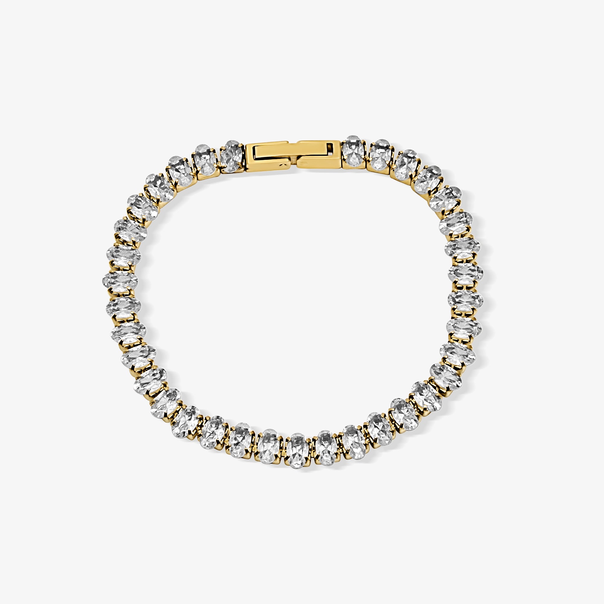 This stunning tennis bracelet features a continuous line of sparkling stones that catch the light from every angle. creating an effortless elegance that works from day to night. The perfectly balanced design sits comfortably on your wrist. delivering that coveted luxury look without the fuss. Whether you're layering it with other pieces or letting it shine solo. this bracelet is your everyday reminder that magic happens when you believe in it.
